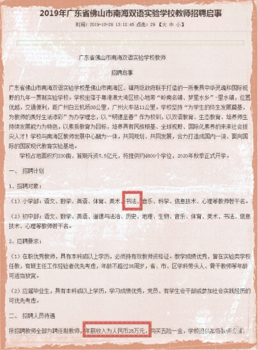 2019年10月佛山市南海雙語實(shí)驗(yàn)學(xué)校的教師招聘啟事,小學(xué)部和中學(xué)部都招聘書法老師,年薪25萬元人民幣、購買五險(xiǎn)一金、提供高級(jí)教師公寓。