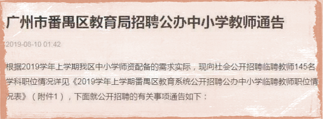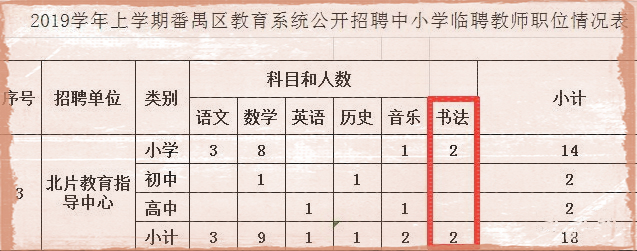 廣州市番禺區(qū)教育局2019年8月招聘公辦小學(xué)書法教師。
