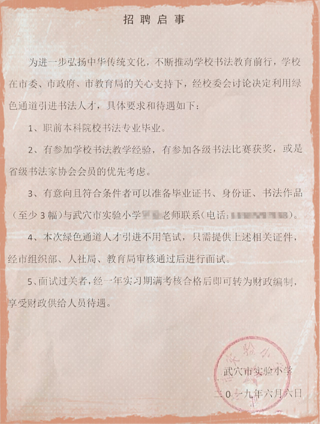 2019年6月,湖北省首家“蘭亭書法學(xué)校”武穴市實(shí)驗(yàn)小學(xué)招聘書法教師,應(yīng)聘者免除筆試,只需提供相關(guān)證件進(jìn)行面試,錄用考核合格后即可轉(zhuǎn)為財(cái)政編制,享受財(cái)政供給人員待遇。