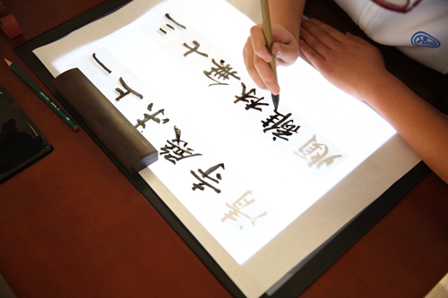 劉書(shū)貴說(shuō):“書(shū)法描摹是掌握漢字結(jié)構(gòu)最有效最直接的一個(gè)方法,這一套設(shè)備對(duì)于初學(xué)書(shū)法的孩子來(lái)說(shuō),作用是很大的,尤其是在這個(gè)屏幕上臨摹古帖的時(shí)候,覆蓋了之后透明度比較高,特別清晰。學(xué)生可以直接用毛筆對(duì)著這個(gè)影子進(jìn)行描摹,這套設(shè)備在這個(gè)方面做的比較好�!�