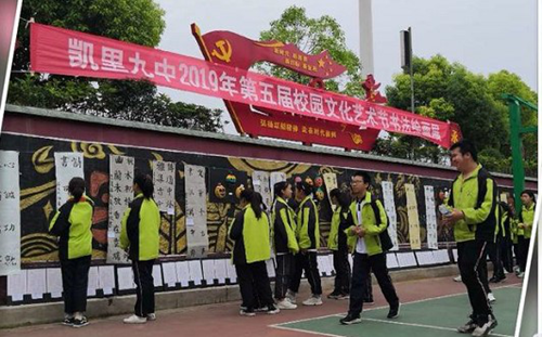 凱里九中2019年的校園文化藝術(shù)節(jié)舉行了書(shū)法比賽,同時(shí)在校園內(nèi)展出了同學(xué)們的書(shū)法和繪畫(huà)作品,頗具神韻的書(shū)法作品引起了同學(xué)們的熱烈圍觀。