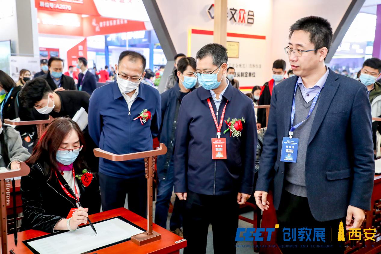 展會首日,陜西省委教育工委委員、陜西省教育廳副廳長趙昶葆,教育部基礎教育司裝備與信息化處處長張權,教育部教育裝備研究與發展中心科研處處長劉強,陜西省教育廳教育技術裝備管理中心主任趙夢,還有來自陜西、甘肅、寧夏、新疆和青海等地區的教育界領導、專家和老師共同蒞臨華文眾合展位參觀指導,詳細了解華文眾合第7代智慧書法教室,現場人氣火爆,咨詢洽談合作的客戶數不勝數。