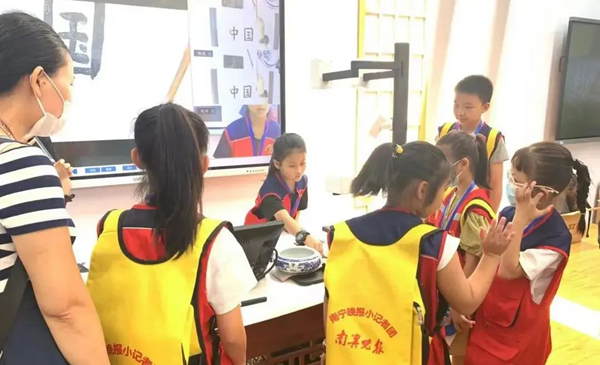 華文眾合工作人員向南寧晚報(bào)小記者們介紹第八代智慧書法教室