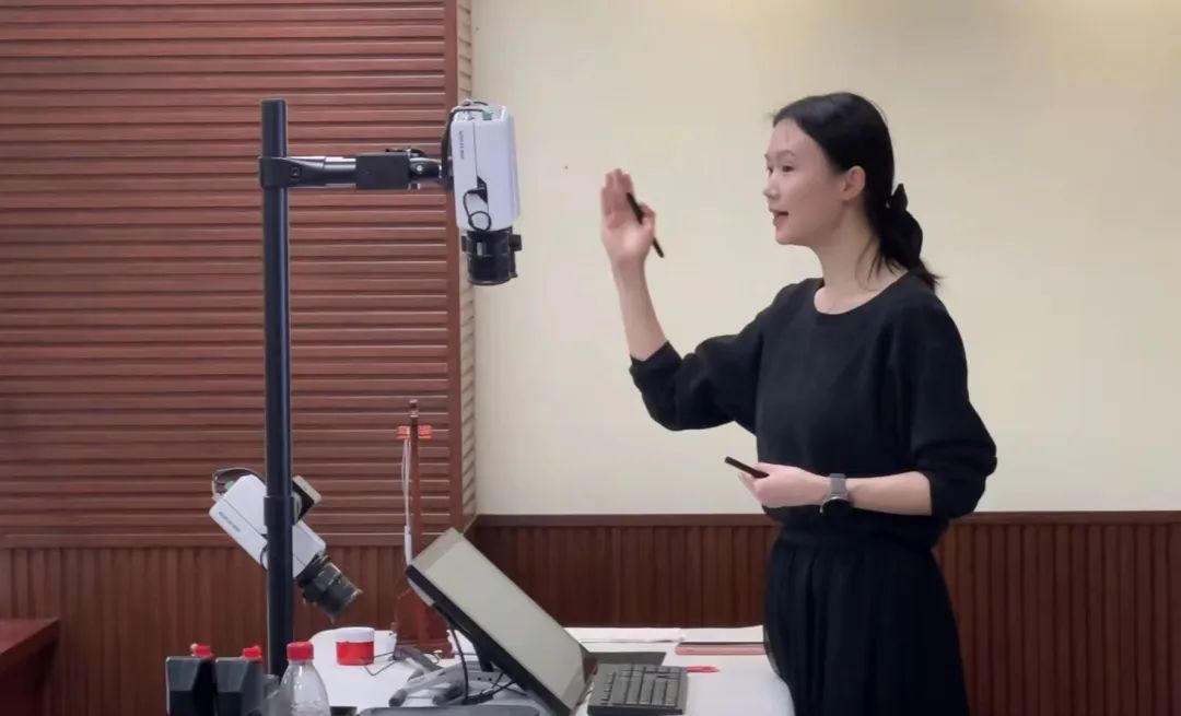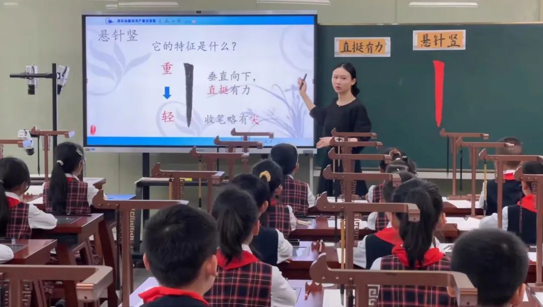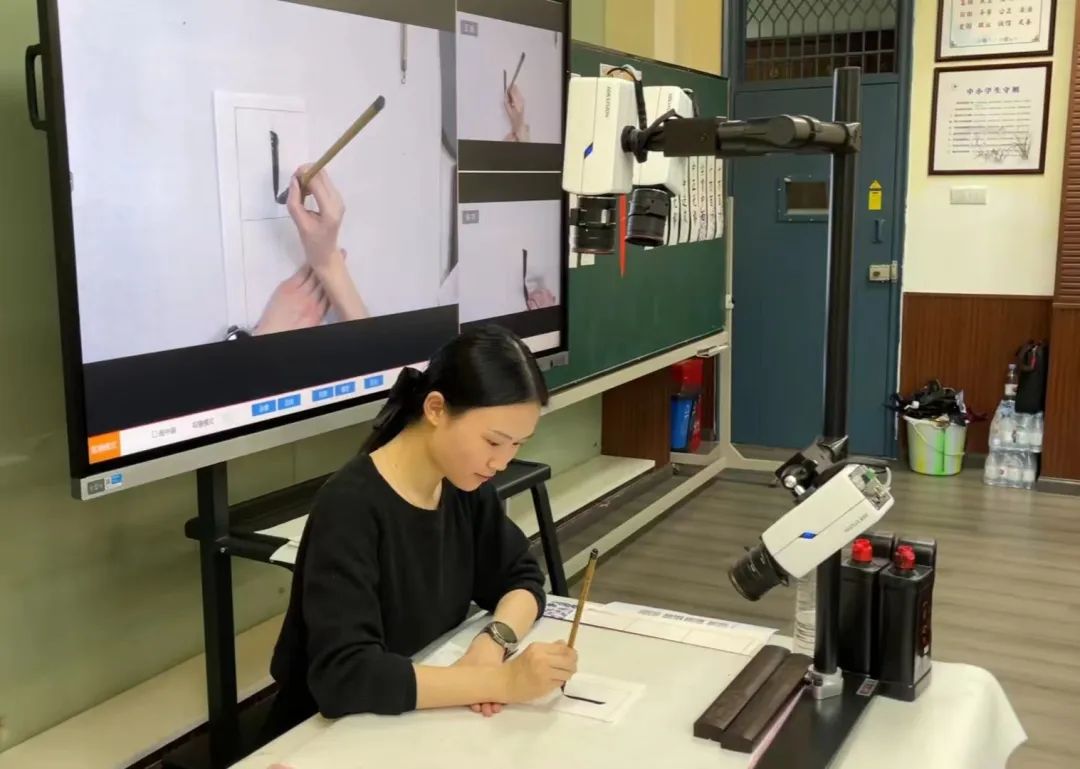 在活動現場,授課教師何悅利用華文眾合智慧書法教室為學生們上了一節別開生面的書法課”。通過直播授課把“懸針豎”的起筆、行筆、運筆、收筆從三個角度進行展示,并同步到每個學生端;通過互動系統更清晰快速地指導學生的書法練習細節;通過邊看邊練讓學生的書法臨摹變得更高效。應用華文眾合智慧書法教室的各項功能,很好地展示了書法教學細節,提升了書法教學質量。