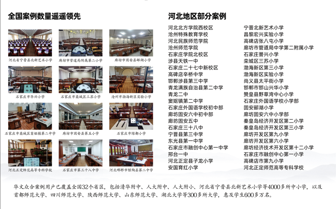 華文眾合多年來不遺余力致力于智慧書法創(chuàng)新,讓傳統(tǒng)書法文化在新時(shí)代以數(shù)字化、智能化的方式得以發(fā)揚(yáng)與傳承。此次河北教育裝備展,華文眾合第8代智慧書法教室、智慧粉筆教室的出彩表現(xiàn)讓我們看到了書法教育現(xiàn)代化的新希望。華文眾合始終在智慧書法領(lǐng)域不斷研發(fā)創(chuàng)新,為師生做好書法教育服務(wù)工作,實(shí)現(xiàn)助力書法教育高質(zhì)量發(fā)展。目前,華文眾合智慧書法教室案例數(shù)量覆蓋全國(guó)32個(gè)省區(qū)4000多所中小學(xué)、300多所大學(xué),其中包括清華大學(xué)附屬中學(xué)、中國(guó)人民大學(xué)附屬中學(xué)、中國(guó)人民大學(xué)附屬小學(xué)、首都師范大學(xué)等名校,惠及學(xué)生600多萬名。
