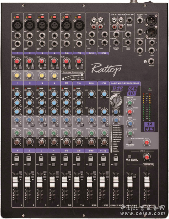產品詳細介紹 12路單聲道麥克風與2組立體聲輸入,12段LED指示燈; 內置DSP數字效果器,提供32種世界級的混響、延時和合唱效果; 高品質、低噪音的平衡式話筒輸入方式; 每路麥克風輸入都配備優質+48V幻像電源;中頻掃頻的三段均衡; 單聲道及主輸出配有的信號插入點,兩組AUX輔助輸出,可以外接處理器; 話筒和線路信號輸入采用平衡連接的XLR接口和 1/4"Jack接口; 采用XLR平衡連接的立體聲主輸出可實現與其他的專業設備最佳的匹配連接; 高精度三色精確電平柱,準確顯示輸出電平; 每個通道自帶全部輸入通道有峰值LED指示燈; 優秀的音質、直觀和條理性強的控制面板,帶信號動態范圍和精細調節的話筒信號控制; 60MM行程高分析度推子,內置式靜噪開關電源器,使用方便靈活; 在每個單聲道和主輸出通道中還設有信號插入點,用于外接信號處理; 專為錄音、現場演出、固定安裝系統或廣播電臺等用戶設計的操作簡單、使用容易、具有優秀音頻特性的調音臺。 技術參數: 頻率響應 20Hz-20KHz±0.5dB 總諧波失真和噪聲 -30dB, mic:30dB, <0.007%母線噪聲:20Hz-20KHz 混音 <-85dBu 通道之間串音 通道啞音>96dB 推子位置 >96dB 輔助發送端口 >86dB 輸入和輸出阻抗 話筒輸入 2.4KΩ 線路輸入 11KΩ 立體聲輸入 100KΩ 輸出 75Ω 輸入和輸出電平 話筒最大輸入 +17dBu 線路最大輸入 +30dBu 立體聲最大輸入 +30dBu 最大混音輸出 +20dBu 耳機最大輸出 300mw/200Ω EQ(單聲道輸入) HF(高頻) 12KHz±15dB MF(中頻) 80Hz-13KHz,±15dB LF(低頻) 80Hz,±15dB 輸出電平表 12段LED指示燈 工作條件 溫度范圍 -10℃~+30℃ 相對濕度 0%~80% 供電 AC:100V-240V;50/60Hz 電源消耗 >30W |
