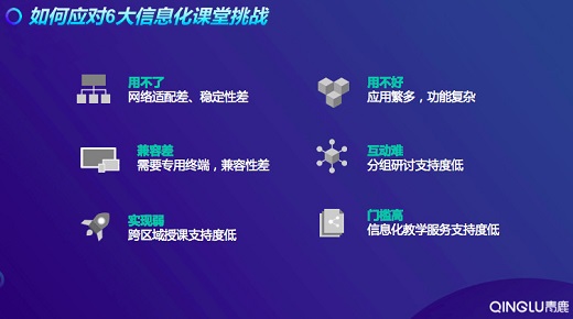 近年來,教育信息化產品推陳出新,但是設備使用和系統操作紛繁復雜,如何利用現代技術加快推動人才培養模式改革,實現規模化教育與個性化培養的有機結合,是我們現在面臨的重大挑戰。青鹿總結,“用不了、用不好、兼容差、互動難、實現弱、門檻高”成為當前課堂實踐中的6大痛點。