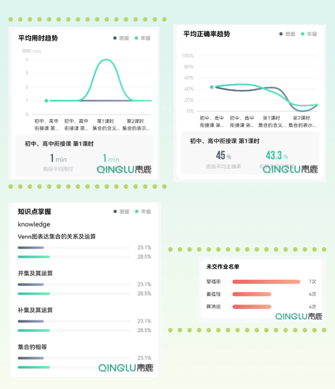 同時,青鹿智慧作業教師端APP還能夠對班級內作業的平均正確率趨勢、平均用時趨勢、知識點掌握情況進行數據分析及展示,未提交作業的情況也能一目了然,教師可以詳細查看更豐富的作業數據,為作業講評、優化教學策略與計劃提供有效參考。