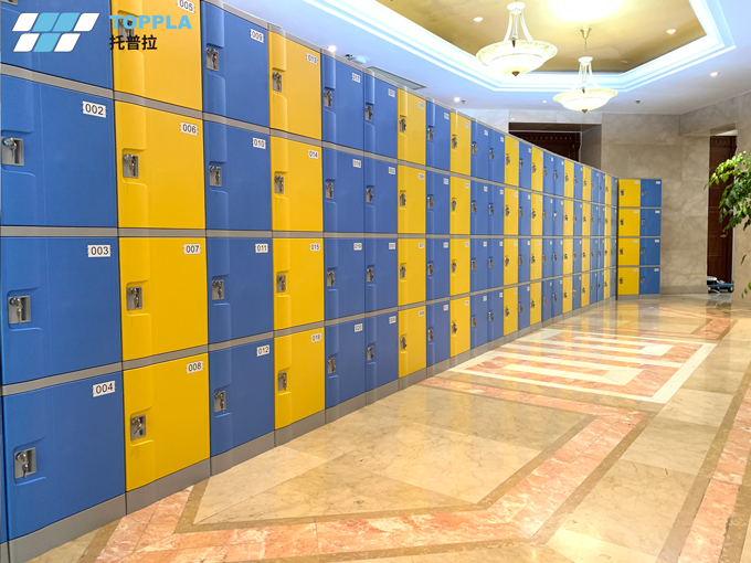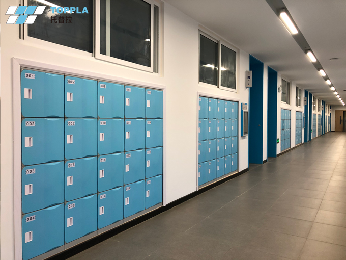 此撞色校園儲物柜解決方案采用托普拉第一代全塑儲物柜T-382S,4門1列、多列組合而成,采用經典藍黃配,大氣不失活力。
