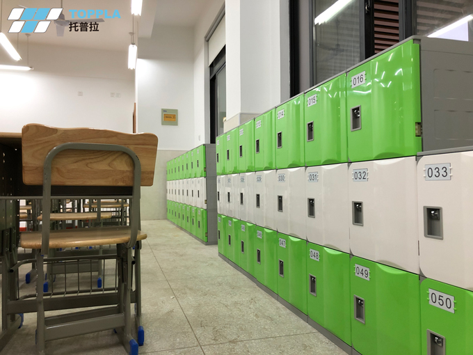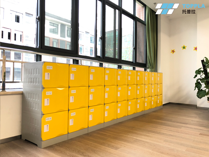 本解決方案使用場景為校園小學部,選取了托普拉第一代全塑儲物柜淺藍色T-320S作為書包柜使用。考慮到孩子身高以及教室窗戶等因素,以2門一列、多列組合使用,置于教室外側走廊,便于小學生存儲物品。