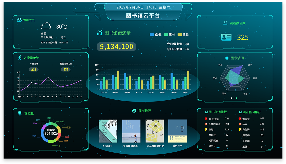 產(chǎn)品詳細介紹1.實時展示圖書館的業(yè)務數(shù)據(jù),包括今日圖書借還量、館藏數(shù)量、到館人次等等(展示內(nèi)容可調(diào)整)。