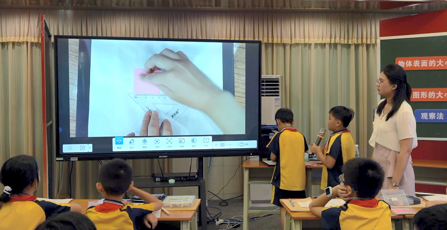 “冰墩墩和雪容融都是孩子們非常熟悉的形象,通過他們爭辯的情景把大家帶到面積的世界里,從聽覺、視覺兩方面同時吸引孩子們的注意力,再引導他們提出面積相關的問題,能夠有效提高課堂教學效果�!标愄依蠋熣f道,巧用安道智能交互教學一體機,導入圖片、音頻創設主題情景,可以將枯燥、深奧的知識場景化、動態化,不僅有利于學生們集中注意力,更能有效引導學生循序觀察,培養學生思考、提出問題的能力,提高學生的思維發展。