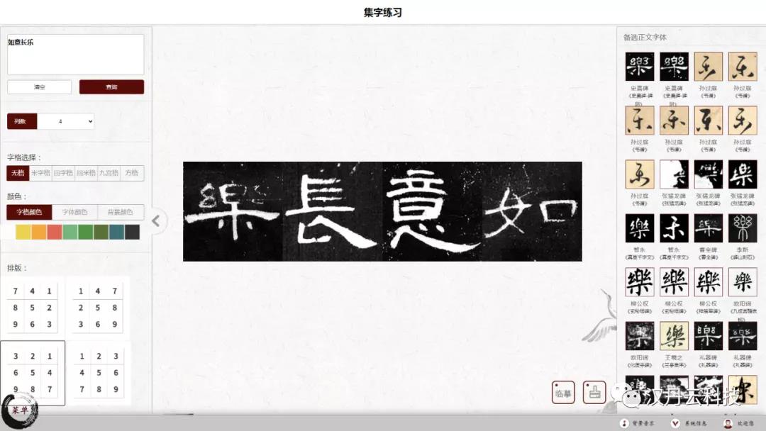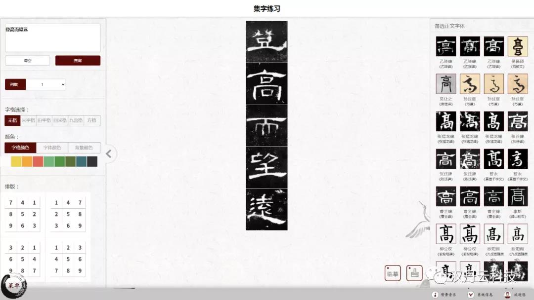 漢丹云智慧書法教室軟件能夠根據(jù)用戶需求,任意選調(diào)《曹全碑》中的例字,并將其按照需要的版式,1-16字選擇排版,當(dāng)場(chǎng)形成書寫字帖,在桌面電腦上可觀賞可臨寫可描摹十分方便!