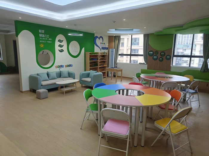 采用柔和的色彩與燈光,劃分為個體咨詢區(qū)、沙盤游戲區(qū)、情緒宣泄區(qū)及團體活動區(qū)。專業(yè)的設(shè)計有效消除了學生的緊張感,讓心理輔導在舒適自然的環(huán)境中悄然進行。