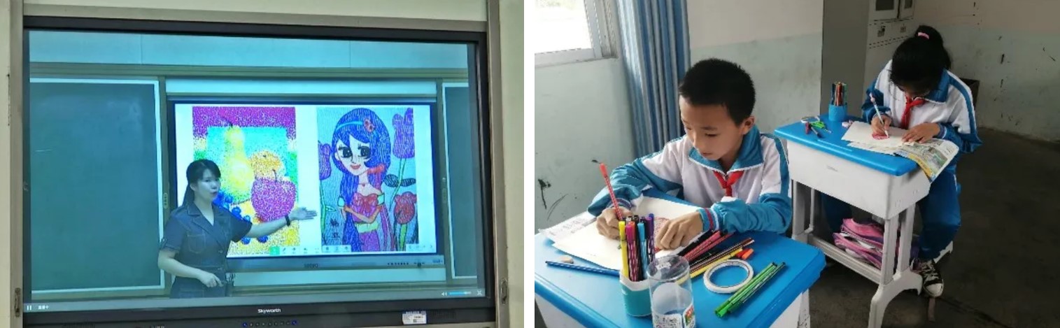 很多農村孩子第一次接觸到這樣的課程,主講教師生動活潑的教學風格,不僅讓農村學校任課老師受益匪淺,也讓孩子們感覺十分新穎。桑樹小學四年級學生馮子祺說:“老師講課非常生動有趣,還鼓勵我們多動手,我們全班同學都很喜歡這樣的美術課。”