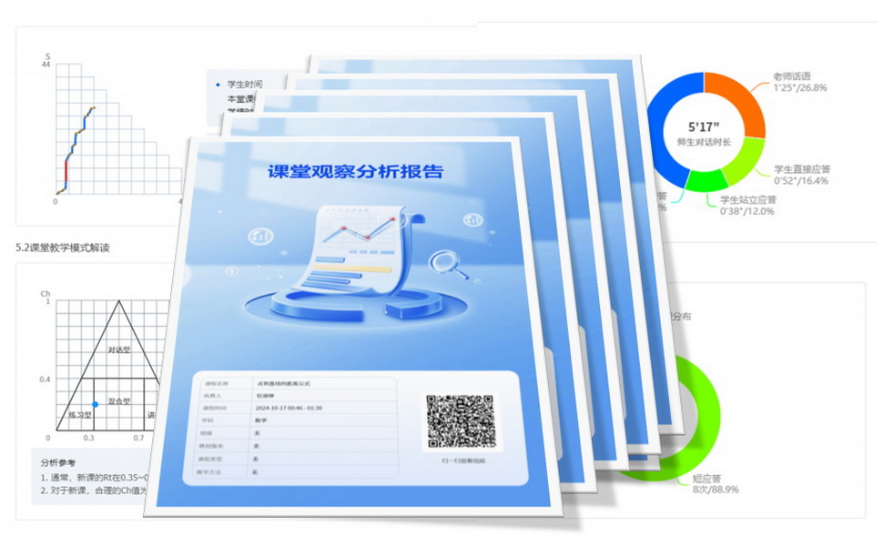 現代中慶為各展示課提供了AI課堂數據分析報告。報告基于現場采集的師生教學行為和語音數據,給出課堂學情、課堂場景、師生行為、提問等等諸多維度實證化的教學反饋,讓授課教師能夠迅速掌握,幫助教師精準改進教學,提升教學質量。