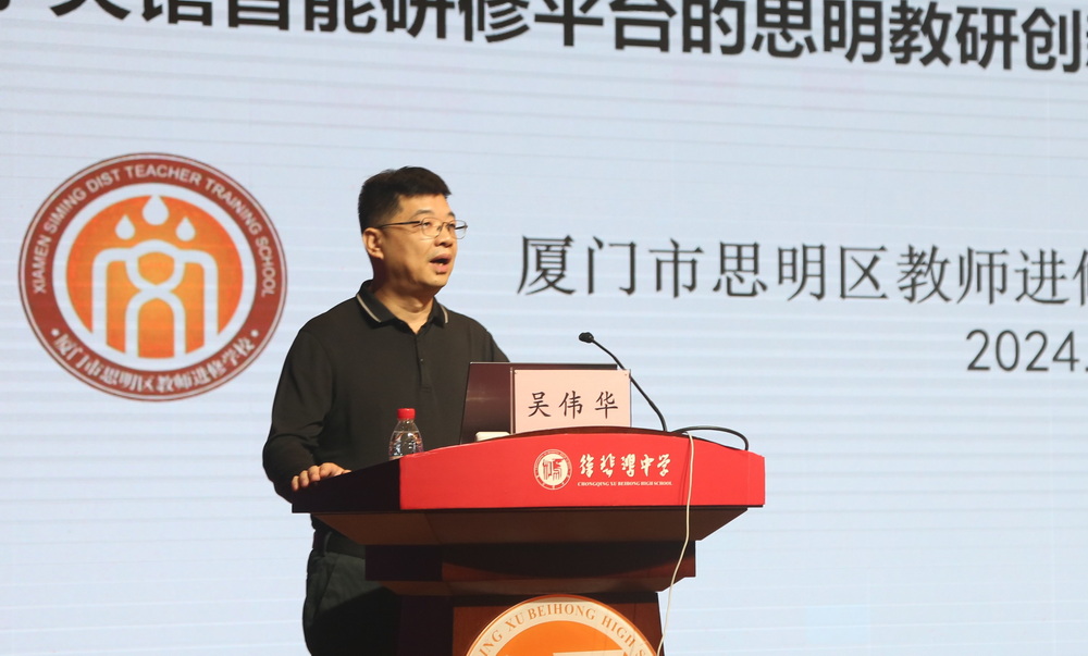 吳偉華做“基于央館智能研修平臺的思明教研創(chuàng)新的實踐與思考”講座,分享了思明區(qū)在智能研修創(chuàng)新中推進的“精心策劃、學科試點、結(jié)合三新、數(shù)據(jù)比較、交流復盤”五步走的路徑探索與思考。