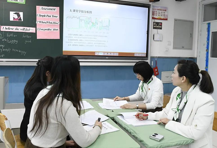 英語(yǔ)組陳宇老師在課堂教學(xué)展示之后,和王麗、孫秀杉、李楠等老師一同開(kāi)展了AI數(shù)據(jù)支持下的現(xiàn)場(chǎng)詢(xún)證教研。