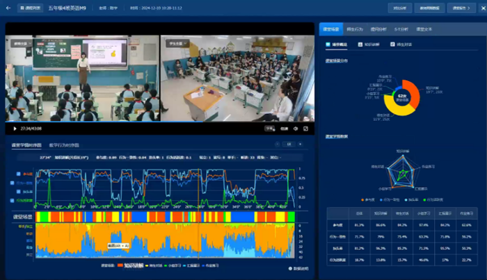 語(yǔ)文組李琳老師《山居秋暝》課堂,AI課堂評(píng)價(jià)系統(tǒng)精準(zhǔn)記錄了小組學(xué)習(xí)中學(xué)生討論時(shí)間、參與程度、行為一致性和活躍性等關(guān)鍵數(shù)據(jù)。李琳老師可以根據(jù)數(shù)據(jù)調(diào)整小組分工合作內(nèi)容或提供學(xué)習(xí)支架,確保學(xué)生在合作中充分發(fā)揮優(yōu)勢(shì)、深度參與討論。AI數(shù)據(jù)的引入突破了傳統(tǒng)課堂評(píng)價(jià)對(duì)合作學(xué)習(xí)難以客觀、細(xì)致了解的局限,可以有效提升合作學(xué)習(xí)的質(zhì)量與效果。