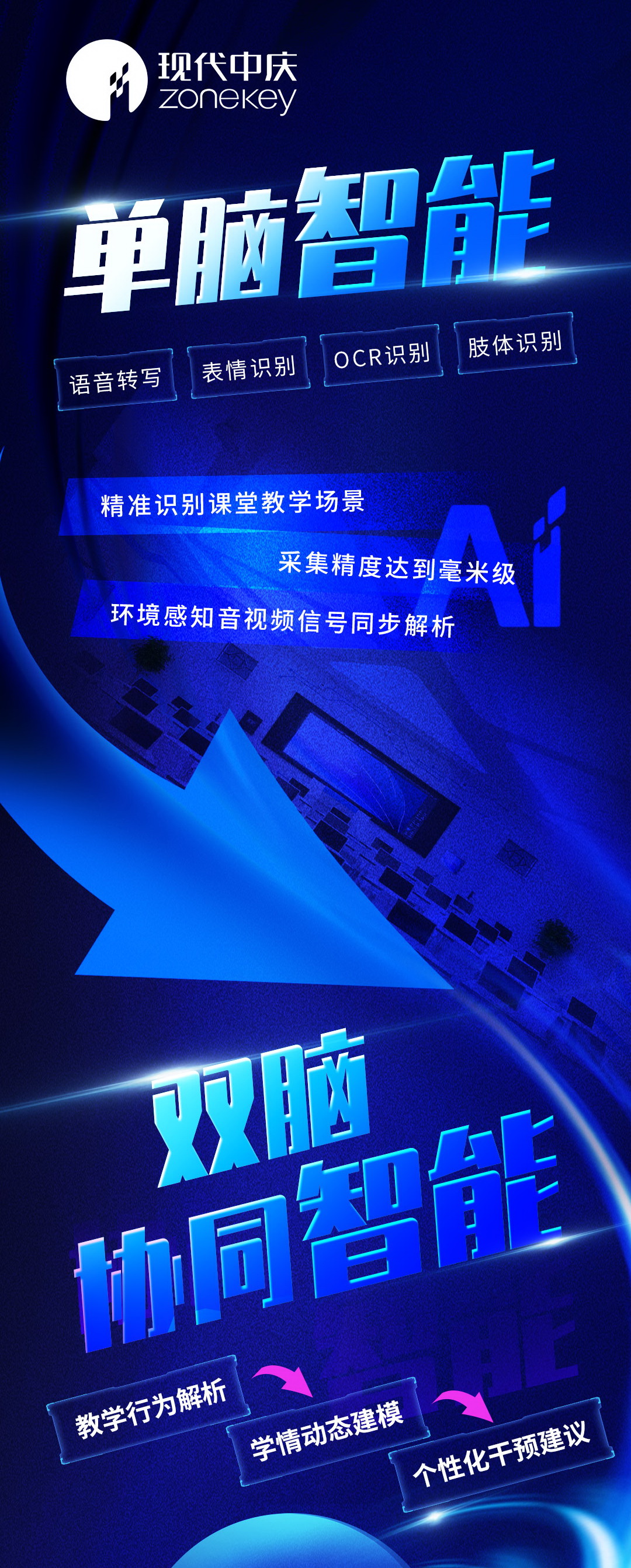 在過去十年中,現代中慶始終聚焦課堂教學應用場景,AI產品主要發力于“單腦智能”,例如語音轉寫、表情識別、OCR識別、肢體識別等,力求精準識別課堂教學場景下師生行為數據和語義多模態數據,采集精度達到毫米級,以及環境感知音視頻信號同步解析等,從而為教師在課后開展精準教研和精準教學反思提供實證依據。
