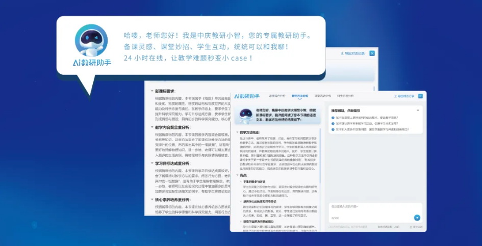 與AI進行深度對話,讓優秀教師的經驗與教育大模型碰撞產生出火花,是這次教研活動另一大亮點。教師們利用中慶AI教研助手軟件,與AI助手(中慶教研小智)采用自然語言的方式,從課程設計、教學目標、教學方法等多個維度進行了深入探討,基于新課標和生成式大模型,小智幫助提煉出課堂的教學亮點,厘清在跨學科融合方面的一些困惑,針對教學中的不足之處,更提供了情景化改進的建議和方案。