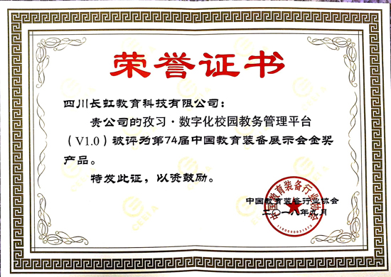 2018孜習·數字化校園教務管理平臺(V1.0)-74屆中國教育裝備展金獎產品證書