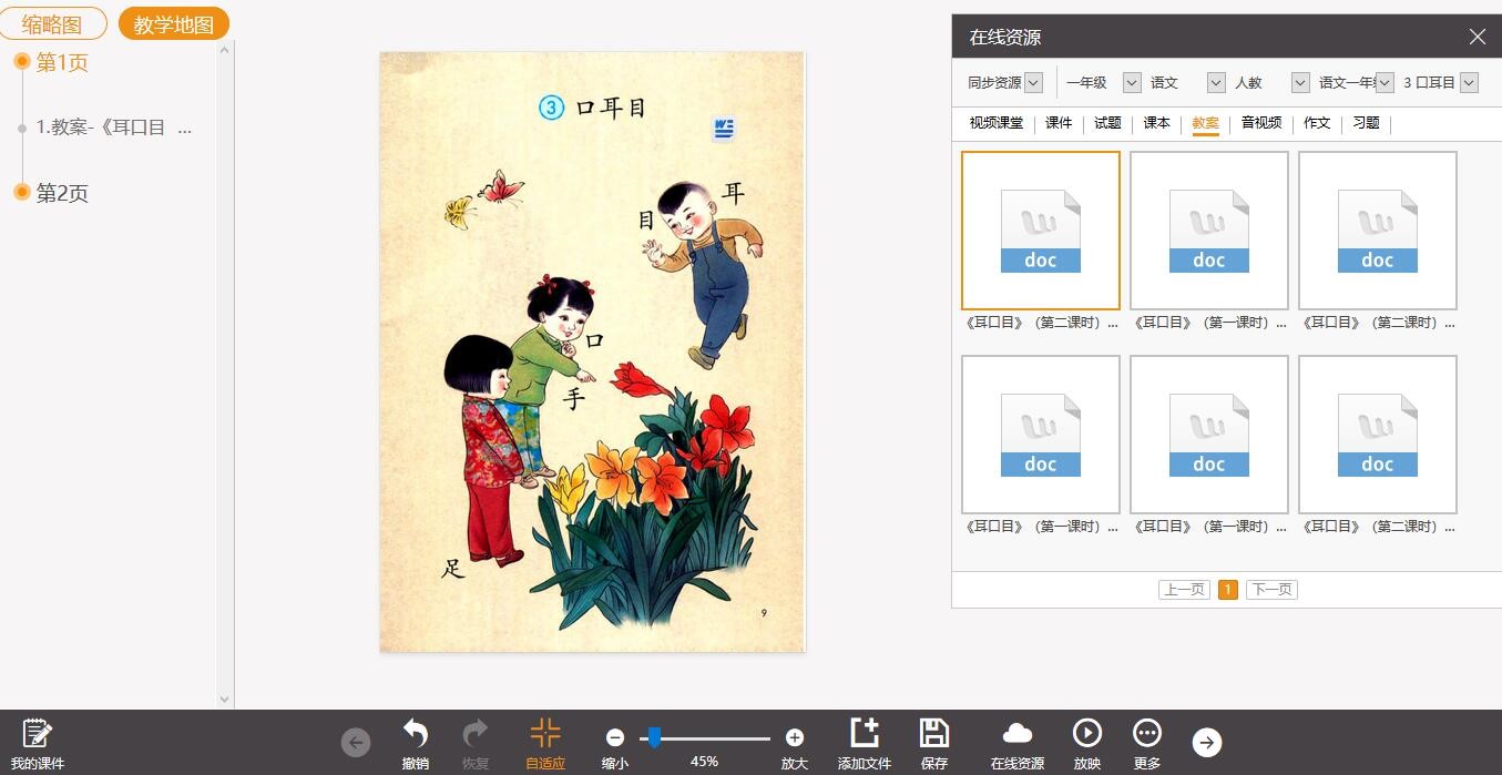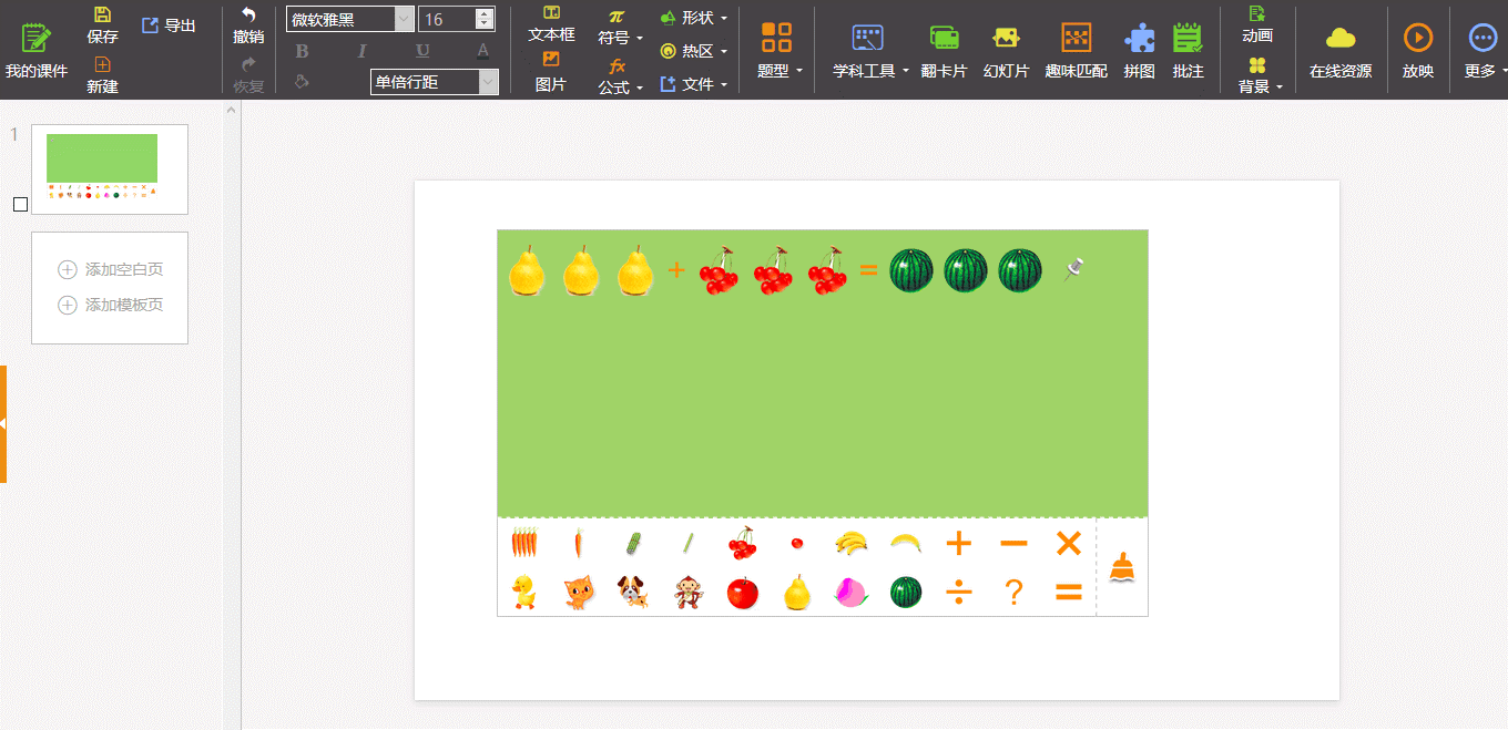 在課件模式下,老師可以自行創(chuàng)建課件,隨時插入在線資源中的現(xiàn)成課件、試題、各種學(xué)科工具,調(diào)動課堂氛圍的互動教學(xué)游戲等。