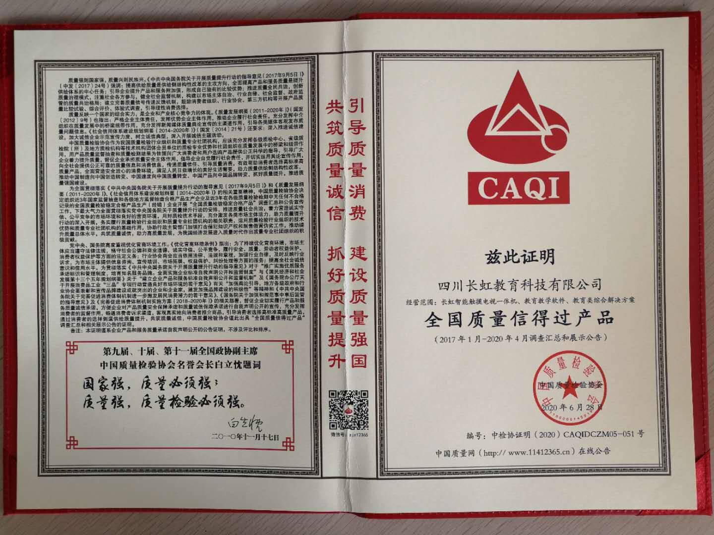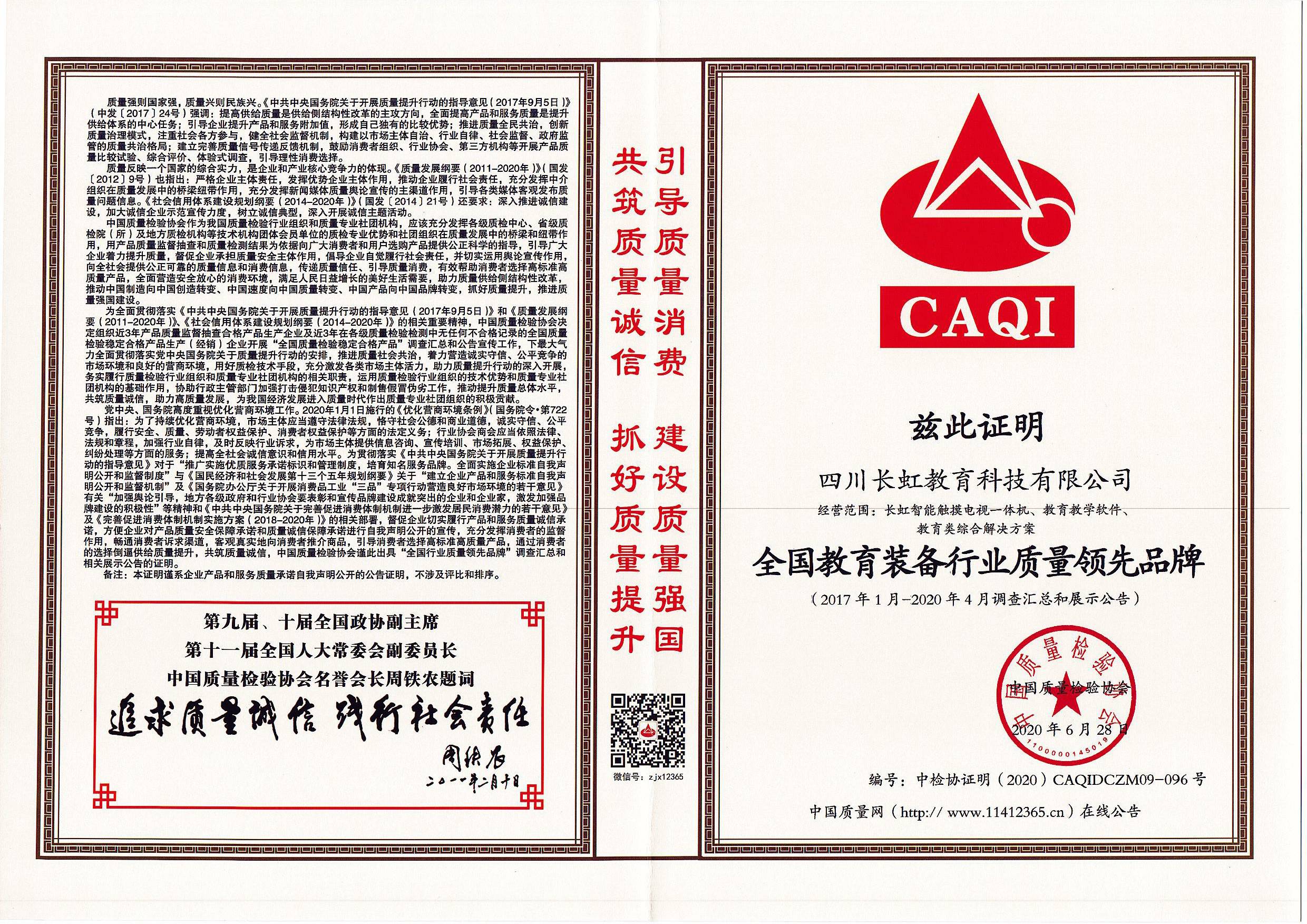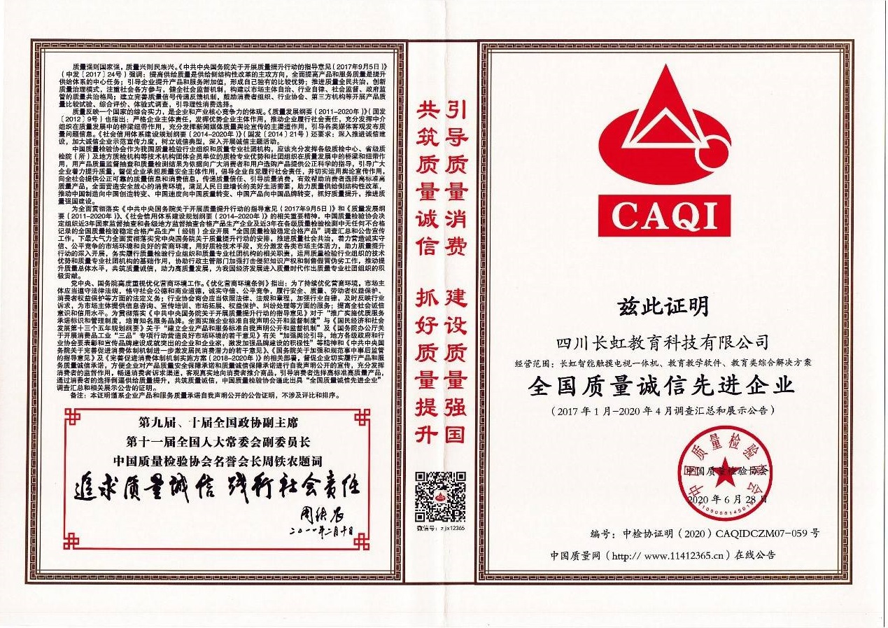 近日,從中國質(zhì)量檢驗(yàn)協(xié)會(huì)獲悉,由國家市場監(jiān)管總局、中宣部、發(fā)改委、教育部、科技部、工業(yè)和信息化部、環(huán)境保護(hù)部等47個(gè)相關(guān)部門聯(lián)合行業(yè)協(xié)會(huì)共同主辦的2020年全國質(zhì)量月活動(dòng),長虹教育科技憑借過硬的產(chǎn)品品質(zhì)、誠信的企業(yè)經(jīng)營再次榮獲“全國教育裝備行業(yè)質(zhì)量領(lǐng)先品牌”、“2020全國質(zhì)量誠信先進(jìn)企業(yè)”、“全國質(zhì)量信得過產(chǎn)品”三項(xiàng)國家質(zhì)量大獎(jiǎng)。