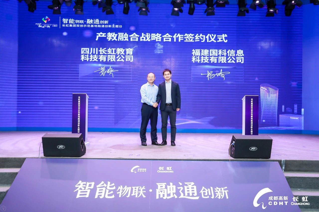主論壇現(xiàn)場,舉行了一系列融通“結(jié)對”儀式,展示最近融通發(fā)展的系列成果。其中四川長虹教育科技有限公司與福建國科信息科技有限公司,進行了產(chǎn)教融合戰(zhàn)略合作簽約儀式,長虹教育公司總經(jīng)理黃煥與國科科技副總經(jīng)理楊波代表雙方進行簽約。