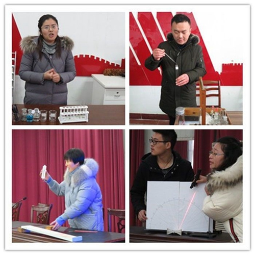 在初中理科實驗操作考試試題創編展示環節,該縣邱廟初中的物理教師王艷春演示了《測斜面的機械效率》;崔樓初中的物理教師王姣姣季寧寧演示了《研究光的反射規律》;尹集中學的化學教師何福銀演示了《探究鋁、鐵、銅的金屬活動性順序》;下樓中學的化學教師張英正演示了《氧氣的制取與檢驗》;靈璧縣初級中學的生物學教師楊云滸演示了《觀察葉片的結構》;游集中學的生物學教師卓鑫演示了《探究口腔內的化學性消化》。