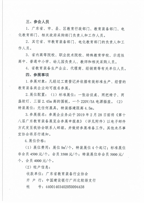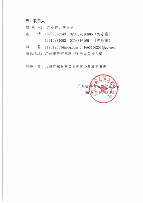 3.參展報名:參展企業(yè)務(wù)必于2019年2月28日前將《第十八屆廣東教育裝備展覽會參展申報表》(詳見附件)以電子郵件方式發(fā)至我協(xié)會聯(lián)系人郵箱,并做好參展準備工作,其他未盡事宜協(xié)會將另行通知。