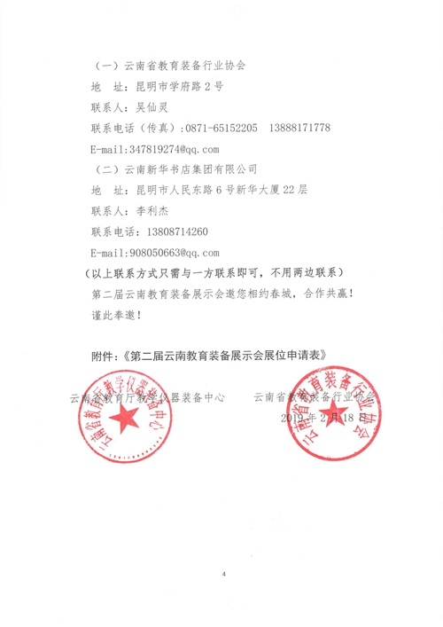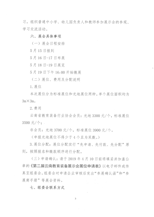 (三)申請確認:請于2019年4月10日前將填妥并加蓋公章的《第二屆云南教育裝備展示會展位申請表》以電子郵件或傳真至組委會。組委會對申請企業審核后發出“參展確認函”和“參展商手冊”等展會資料。