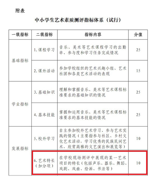 《中小學生藝術素質測評指標體系(試行)》規定“書法特長生加10分”。
