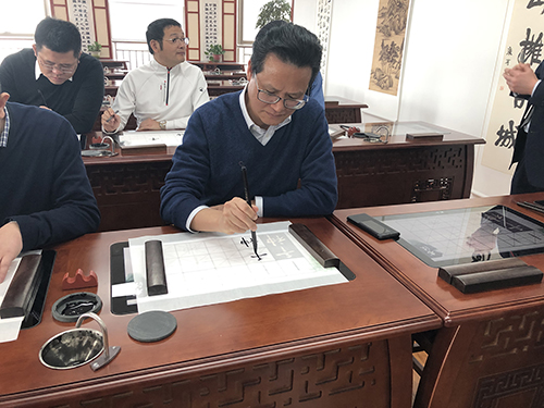 領(lǐng)導(dǎo)們仔細觀看了產(chǎn)品演示,并饒有興趣地親自體驗使用翰和智慧書法標(biāo)準教室,同時得到深刻的體會與感悟。