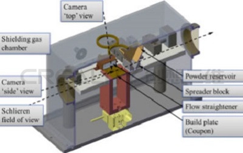 開放式架構(gòu)PBF系統(tǒng)的示意圖,其中包括對高速成像和紋影成像的修改�?茖W(xué)家們使用開放式結(jié)構(gòu)PBF系統(tǒng)進(jìn)行現(xiàn)場測量,提供完全密集組件的自動構(gòu)建。電腦提供了構(gòu)建板在層之間的垂直移動、硅繩粉末涂布機(jī)的運動、激光照射和掃描和靈活性可用于激光功率和速度。