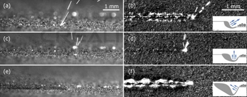 使用激光功率掃描單個軌道(從左到右掃描方向)時的側(cè)視圖和俯視圖的高速圖像,掃描速度為(a)和(b)50 W和0.1 m / s; (c)和(d)100W和0.5m / s以及(e)和(f)200W和1m / s。插圖是熔池形狀的示意圖,其決定了激光羽流方向。所有數(shù)字的視頻都包含在補充材料中。