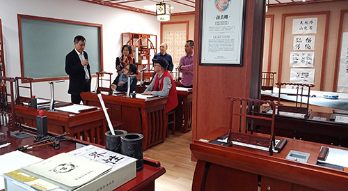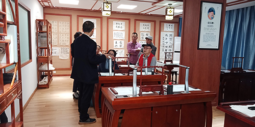 在董事長陳登貴先生的陪同下,東莞市書法家協會一行領導參觀了智慧書法教室展廳,詳細了解了公司智慧書法教室的軟、硬件研發(fā)情況,并對廣視通智慧書法教室所取得的成績給予了高度評價,同時也提出了一些建設性、針對性和可操作性建議。
