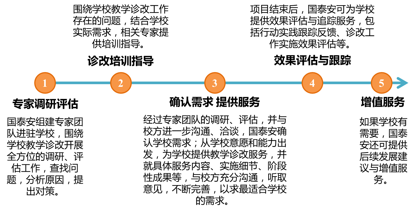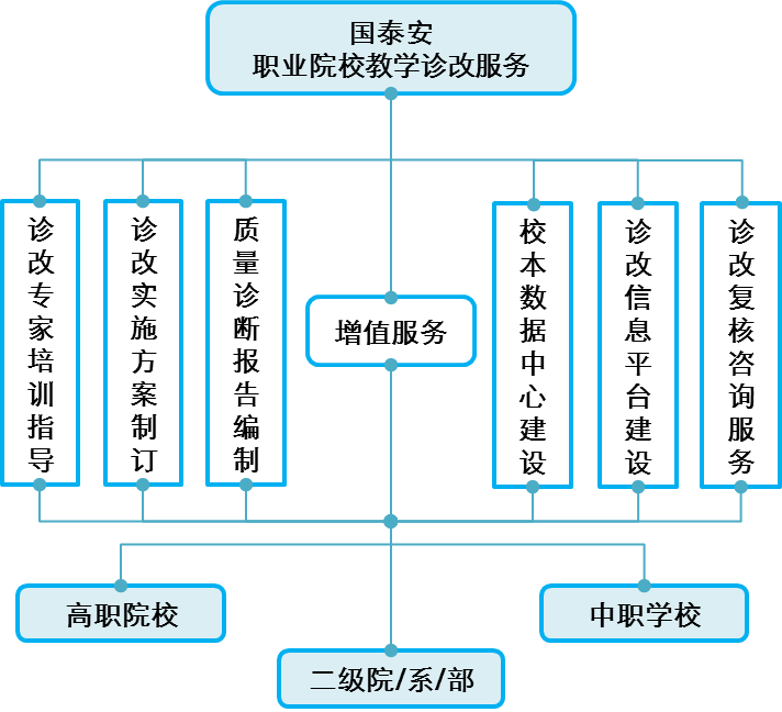 圍繞教學(xué)診改,國(guó)泰安組建由診改專(zhuān)家、專(zhuān)業(yè)研究人員、專(zhuān)業(yè)技術(shù)人員組成的專(zhuān)門(mén)項(xiàng)目團(tuán)隊(duì),以學(xué)校實(shí)際需求為導(dǎo)向,整體規(guī)劃相關(guān)產(chǎn)品開(kāi)發(fā)和服務(wù)內(nèi)容,按照專(zhuān)家調(diào)研評(píng)估—診改培訓(xùn)指導(dǎo)—確認(rèn)需求、提供服務(wù)—效果評(píng)估與跟蹤—增值服務(wù)等步驟,分步推進(jìn),有序開(kāi)展,不斷改進(jìn)。