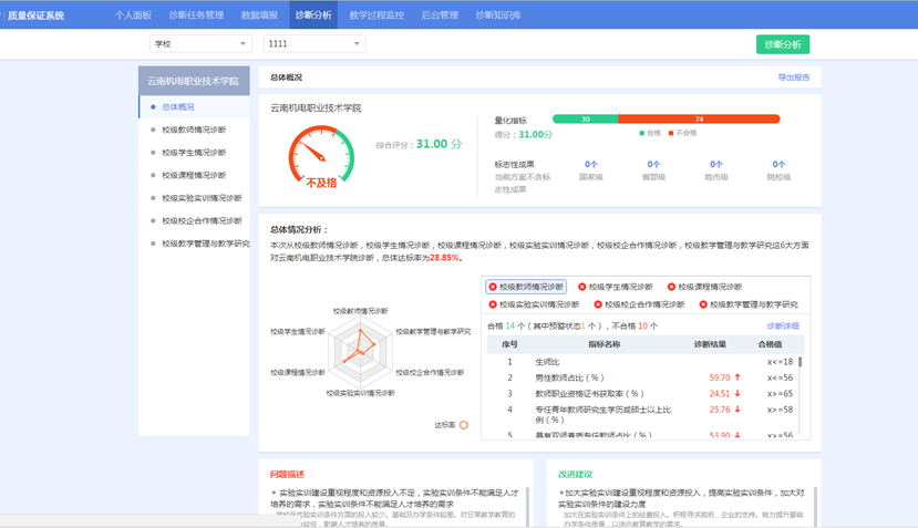 云南機(jī)電職業(yè)技術(shù)學(xué)院:根據(jù)學(xué)校教育教學(xué)實(shí)際情況,梳理5套指標(biāo)庫(kù),共計(jì)261個(gè)指標(biāo),以滿足學(xué)校質(zhì)量診斷的需求;在學(xué)校現(xiàn)有的信息化基礎(chǔ)上,建設(shè)校本數(shù)據(jù)中心和質(zhì)量保證系統(tǒng),實(shí)現(xiàn)學(xué)校各項(xiàng)業(yè)務(wù)數(shù)據(jù)的互聯(lián)互通,實(shí)時(shí)診斷學(xué)校質(zhì)量狀態(tài),及時(shí)發(fā)現(xiàn)質(zhì)量問(wèn)題。