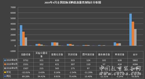 9月份,根據中國教育裝備網對國內教育裝備招中標采購信息量的數據統計,國內教育裝備市場招標采購信息總量為4396條,環比下降25.01%,同比增長43.85%。由此可以看出,進入開學季后招標采購信息總量會呈現下降趨勢。