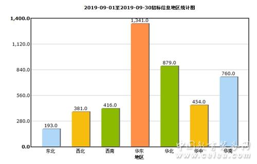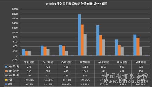 綜合9月全國招標采購信息量地區統計分析圖(如圖5所示):西北地區環比下降10.98%,同比增長41.11%;華東地區環比下降24.75%,同比增長42.06%;華南地區環比下降16.30%,同比增長105.96%;華北地區環比下降32.75%,同比增長27.02%;華中地區環比下降34.39%,同比增長19.79%;東北地區環比下降29.30%,同比下降6.76%;西南地區環比下降11.11%,同比增長109.05%。