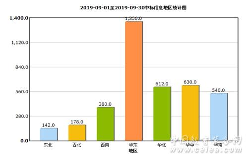 從9月中標信息地區統計圖(如圖8所示)和全國中標信息地區占比圖(如圖9所示)來看:華東地區中標信息量為1356條,占比35%;華中地區中標信息量為630條,占比16%;華北地區中標信息量為612條,占比16%;華南地區中標信息量為540條,占比14%;西南地區招中標信息量為380條,占比10%;西北地區中標信息量為178條,占比5%;東北地區中標信息量為142條,占比4%。