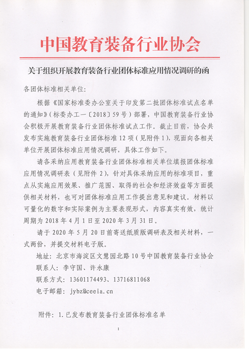 中國教育裝備行業(yè)協(xié)會團(tuán)體標(biāo)準(zhǔn)委員會關(guān)于組織開展教育裝備行業(yè)團(tuán)體標(biāo)準(zhǔn)應(yīng)用情況調(diào)研的函