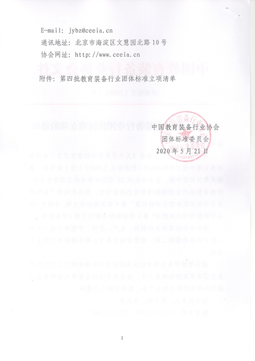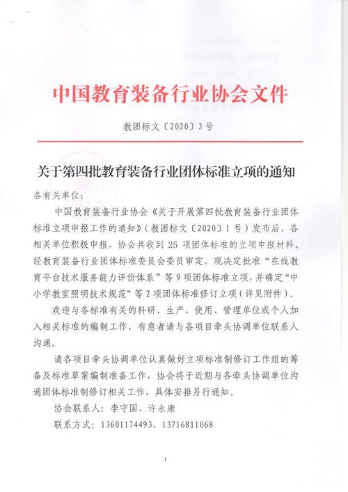 中國(guó)教育裝備行業(yè)協(xié)會(huì)《關(guān)于開(kāi)展第四批教育裝備行業(yè)團(tuán)體標(biāo)準(zhǔn)立項(xiàng)申報(bào)工作的通知》(教團(tuán)標(biāo)文〔2020〕1號(hào))發(fā)布后,各相關(guān)單位積極申報(bào),協(xié)會(huì)共收到25項(xiàng)團(tuán)體標(biāo)準(zhǔn)的立項(xiàng)申報(bào)材料。經(jīng)教育裝備行業(yè)團(tuán)體標(biāo)準(zhǔn)委員會(huì)委員審定,現(xiàn)決定批準(zhǔn)“在線教育平臺(tái)技術(shù)服務(wù)能力評(píng)價(jià)體系”等9項(xiàng)團(tuán)體標(biāo)準(zhǔn)立項(xiàng),并確定“中小學(xué)教室照明技術(shù)規(guī)范”等2項(xiàng)團(tuán)體標(biāo)準(zhǔn)修訂立項(xiàng)(詳見(jiàn)附件)。