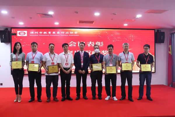 教育部關工委常務副主任、國家督學、中國教育裝備行業協會王富會長、深圳市教育裝備行業協會彭錦環會長為榮獲突出貢獻獎的企業代表頒獎