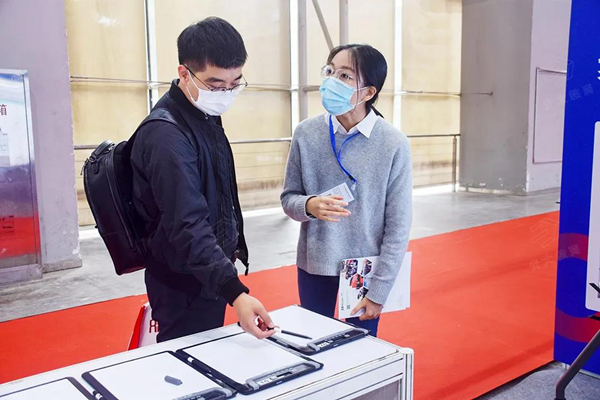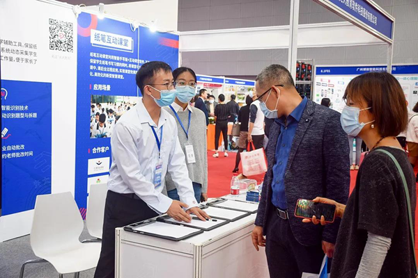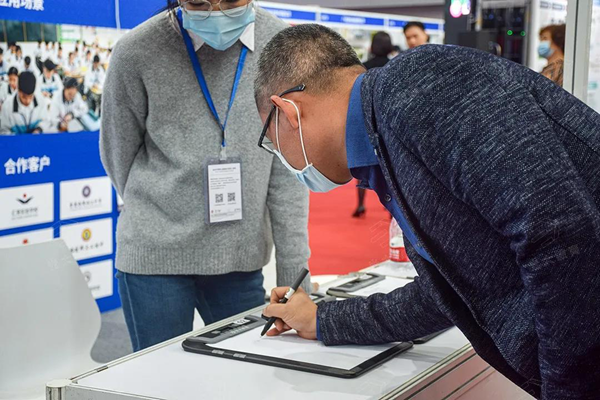 每位進過展位的來賓都會停下腳步,向在場的工作人員詢問:“這個(智能手寫板)怎么在課堂上使用呀?”講師熱情地邀請來賓體驗紙筆互動課堂,將作業放在智能手寫板上,用筆隨意在紙上書寫,書寫的內容呈現在屏幕上,筆跡完整還原。