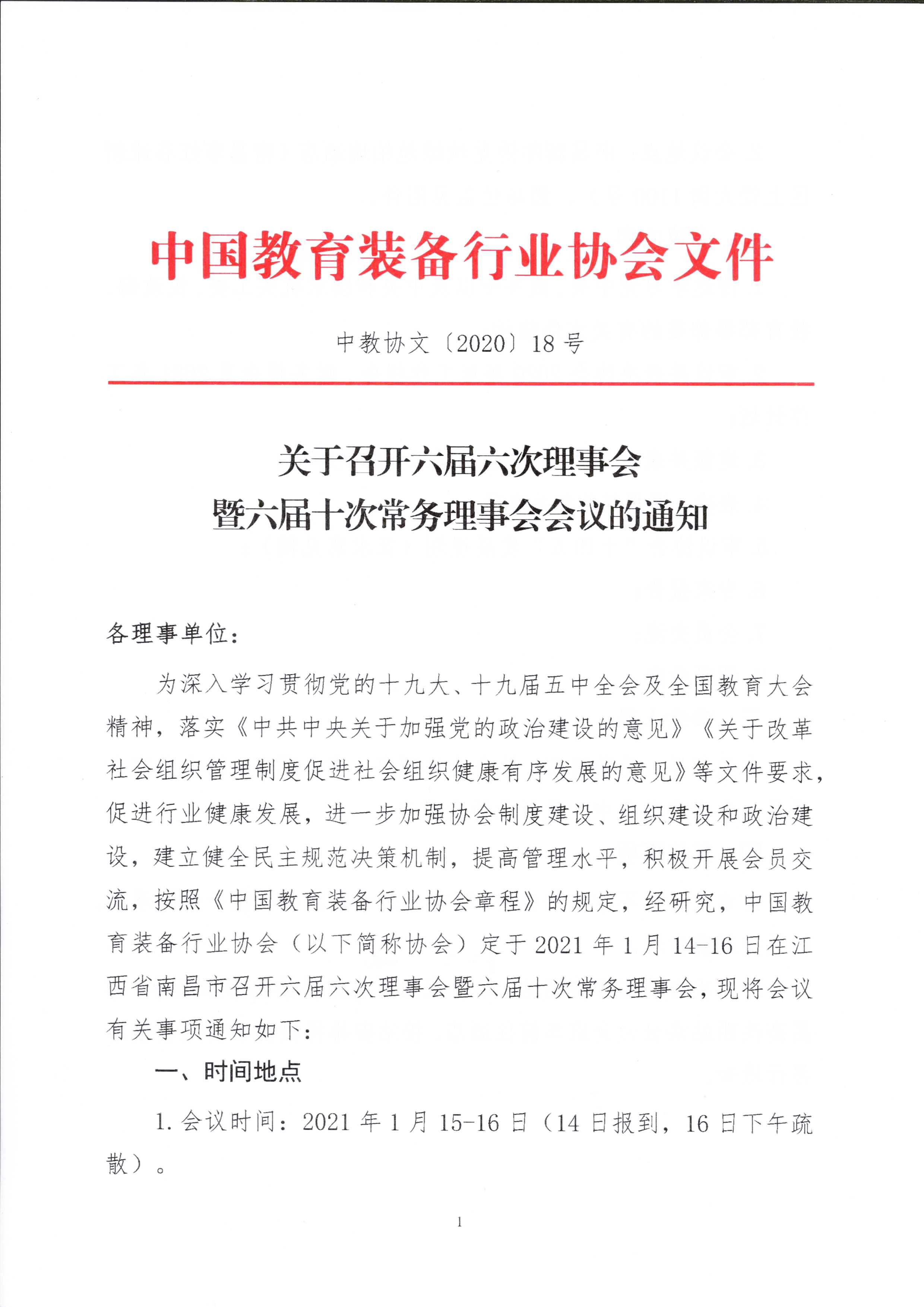 為深入學(xué)習(xí)貫徹黨的十九大、十九屆五中全會(huì)及全國(guó)教育大會(huì)精神,落實(shí)《中共中央關(guān)于加強(qiáng)黨的政治建設(shè)的意見(jiàn)》《關(guān)于改革社會(huì)組織管理制度促進(jìn)社會(huì)組織健康有序發(fā)展的意見(jiàn)》等文件要求,促進(jìn)行業(yè)健康發(fā)展,進(jìn)一步加強(qiáng)協(xié)會(huì)制度建設(shè)、組織建設(shè)和政治建設(shè),建立健全民主規(guī)范決策機(jī)制,提高管理水平,積極開(kāi)展會(huì)員交流,按照《中國(guó)教育裝備行業(yè)協(xié)會(huì)章程》的規(guī)定,經(jīng)研究,中國(guó)教育裝備行業(yè)協(xié)會(huì)(以下簡(jiǎn)稱(chēng)協(xié)會(huì))定于2021年1月14-16日在江西省南昌市召開(kāi)六屆六次理事會(huì)暨六屆十次常務(wù)理事會(huì),現(xiàn)將會(huì)議有關(guān)事項(xiàng)通知如下:
