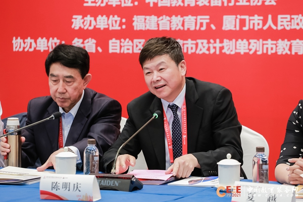 福建省教育廳黨組成員、副廳長陳明慶,中國教育報刊社副社長夏越,教育部基礎教育司教學與裝備信息化處處長張權,廈門市教育局副局長陳珍,中國教育裝備行業協會常務副會長李興植,中國教育裝備行業協會監事會副監事長劉宜,福建教育裝備與基建中心主任何光輝,四川省教育廳技術物資裝備管理指導中心主任王方文出席會議。中國教育裝備行業協會副會長兼秘書長夏國明主持會議。
