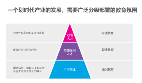 鐘永認為,“一個劃時代產業的發展,需要廣泛分級部署的教育氛圍。”針對廣泛群體、技能應用人才和研發人才這三類人才梯隊,優必選科技打造了從K12到高校的貫通式培養體系,分層部署,用通識教育培養能夠適應及理解人工智能時代變化的青少年人才、用職業教育培養能推進產業化落地應用的技能型人才、用專業教育培養引領產業未來的發展與革新的科研人才。