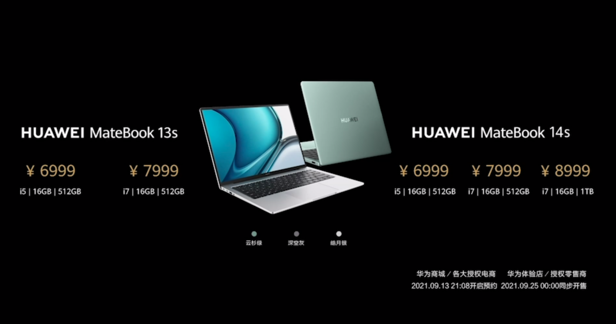 華為MateBook13s筆記本電腦i5/16GB/512GB版售價6999元,i7/16GB/512GB版售價7999元;華為MateBook 14s筆記本電腦i5/16GB/512GB版售價6999元,i7/16GB/512GB版售價7999元,i7/16GB/1TB版售價8999元。2021年9月13日21:08,華為MateBook 13s、MateBook 14s開始預(yù)約,9月25日0點正式開售。首銷當(dāng)天兩款新品均享受直降100元優(yōu)惠,購買華為MateBook 13s還贈華為dock2擴(kuò)展塢。購買華為MateBook 13s、MateBook 14s的用戶9月25-10月13日完成曬單好評還有機(jī)會獲得華為藍(lán)牙鼠標(biāo)。